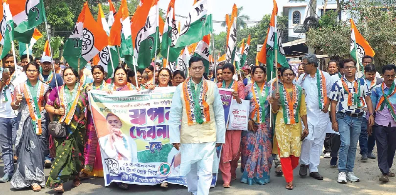 ভোট প্রচারে বেরিয়ে চাষিদের সঙ্গে ধান ঝারাইয়ের কাজে হাত লাগালেন পূর্বস্থলী দক্ষিণ বিধানসভার তৃণমূল কংগ্রেস প্রার্থী স্বপন দেবনাথ